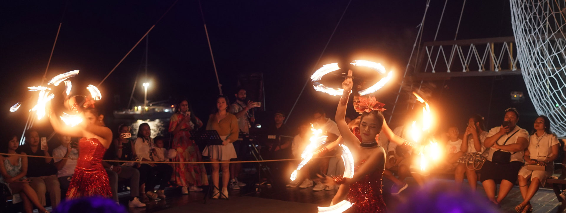 As the day fades into twilight, the scene transforms into an electrifying spectacle of shimmering lights and pulsating energy. The boat comes alive with colorful lights and the sounds of DJs spinning infectious tunes that beckon you to the dance floor. Sip on cocktails under the starlit sky or simply bask in the ambiance of an unforgettable evening on the sea.